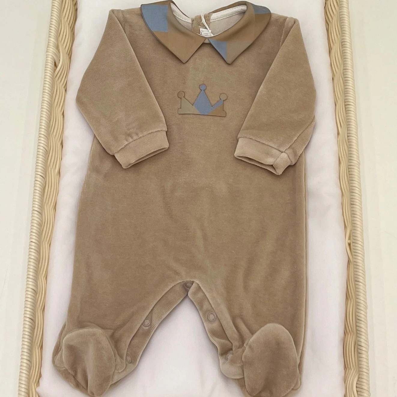 Una tutina intera per neonato in ciniglia color nocciola, ideale per l’inverno grazie al suo tessuto soffice e caldo. Il design presenta un delicato colletto in taffetà che aggiunge un tocco di eleganza, mentre una graziosa stampa sempre in taffetà decora la parte anteriore, rendendo il capo raffinato e confortevole per il tuo piccolo.