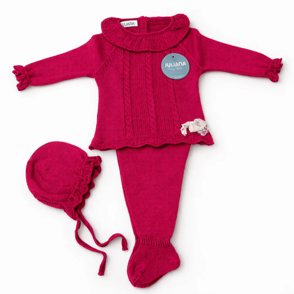 Tutina spezzata in lana con ghettine e cuffia abbinata, caratterizzata da trecce verticali e colletto classico.