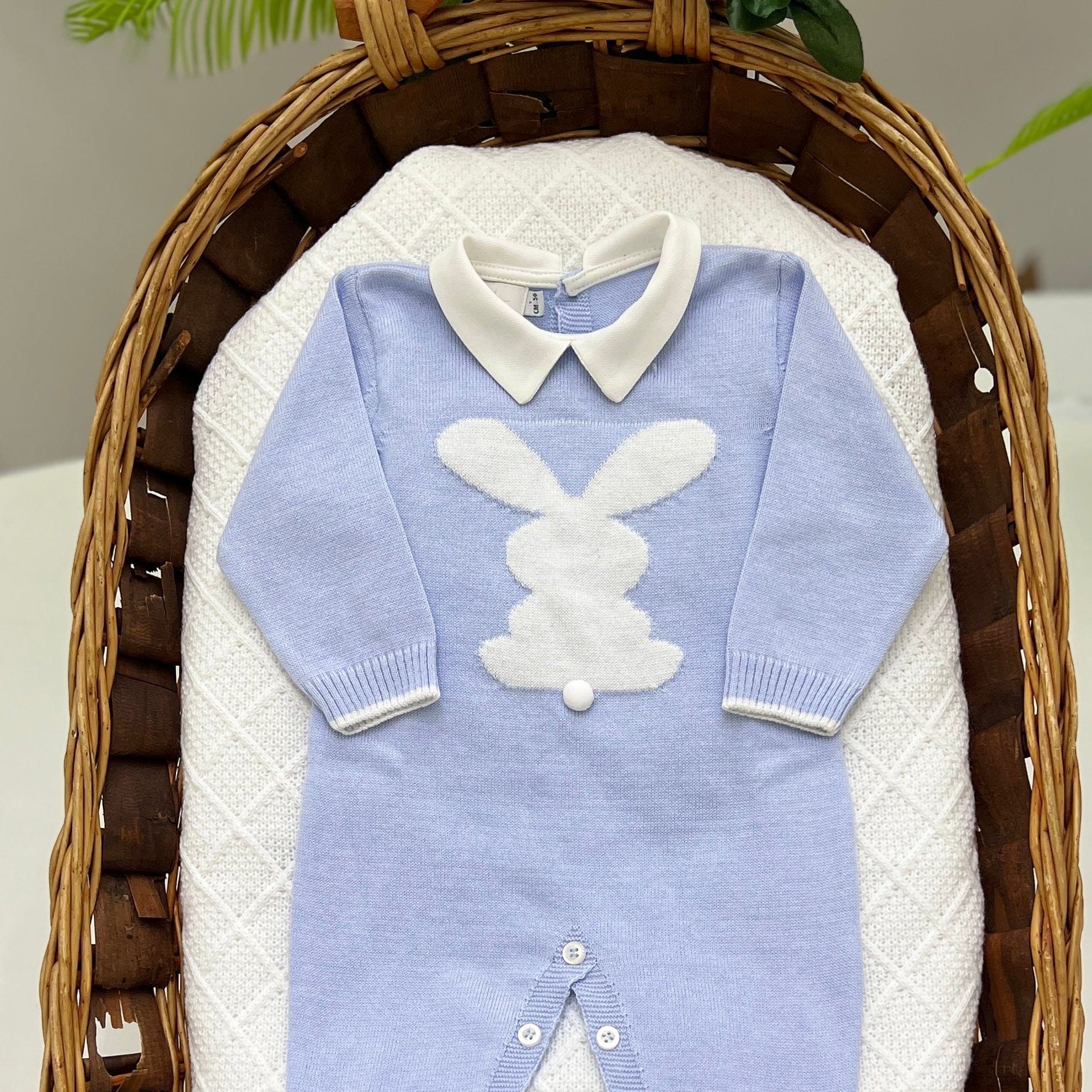 Tutina intera in filo di cotone celeste, con colletto in piquet e coniglietto raffigurato sul davanti. Un capo raffinato e confortevole, ideale per i primi giorni del neonato.