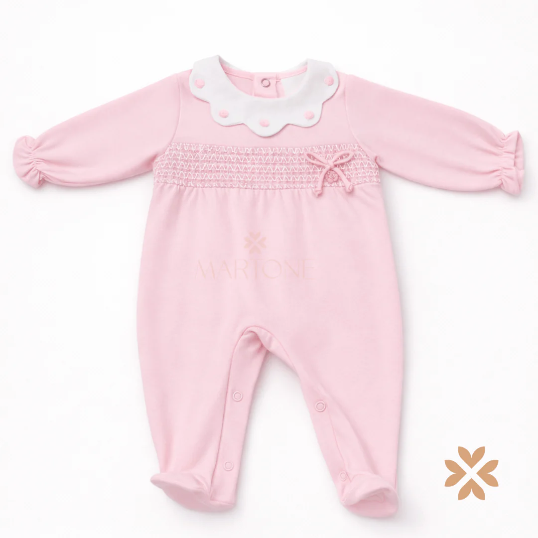 Tutina intera per neonata in cotone rosa, con colletto sagomato a contrasto rifinito da piccoli dettagli applicati. Ricamo smock sul davanti con fiocco decorativo, maniche lunghe con polsini arricciati e linea armoniosa. Chiusura posteriore e al cavallo per una vestibilità pratica e ordinata.