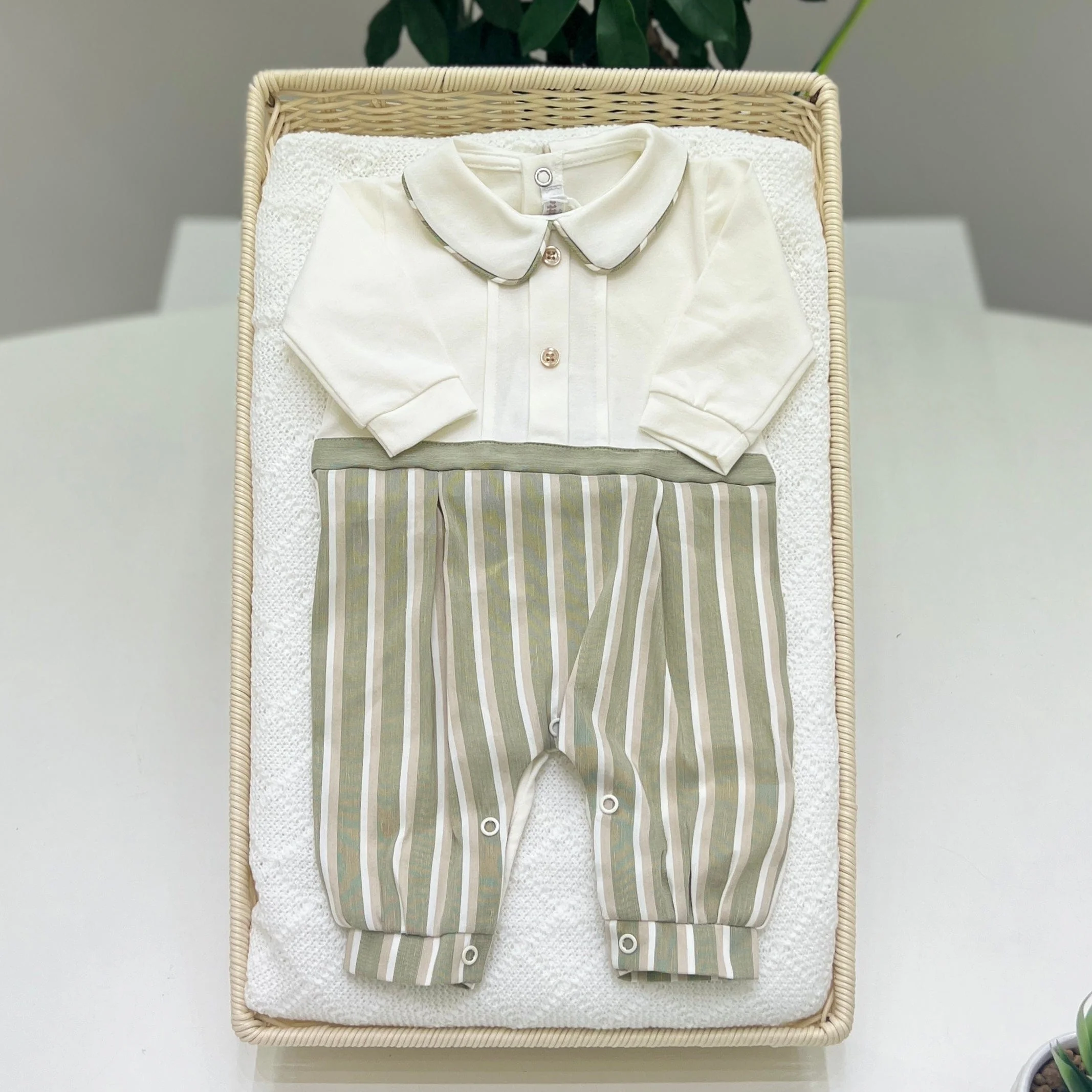 Una tutina raffinata e confortevole, realizzata in morbido cotone con un’elegante parte frontale in lino a righe. Un design curato nei dettagli, perfetto per un’occasione speciale, che unisce stile e praticità.