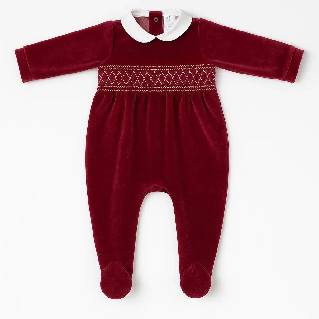 Tutina intera per neonata in ciniglia bordeaux, con colletto bianco e ricamo smock sul petto a contrasto. Modello con piedini integrati e chiusura posteriore con bottoncini automatici.