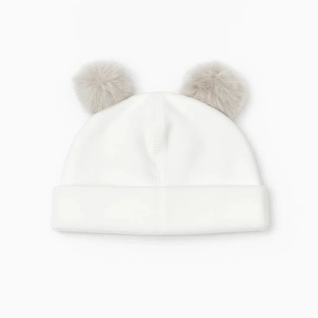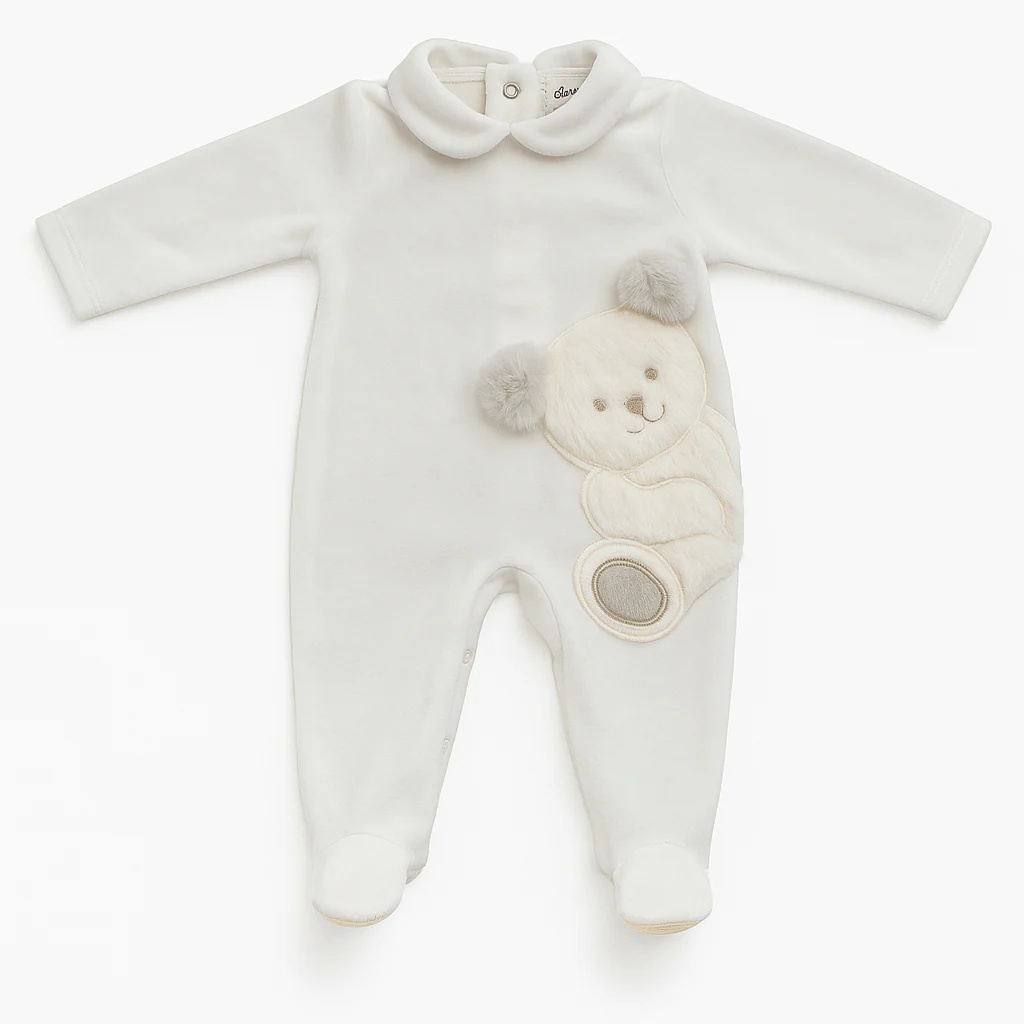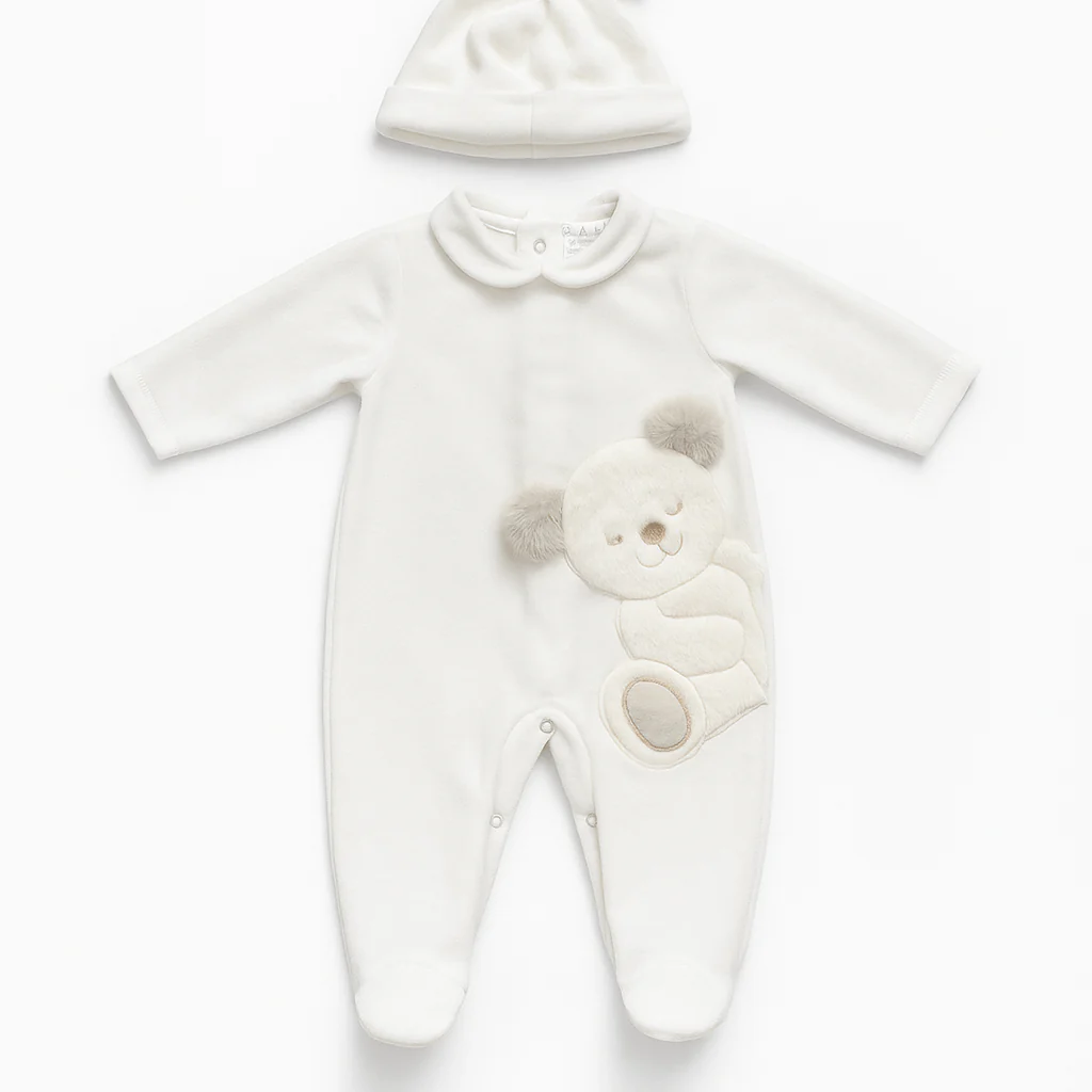 Tutina intera per neonato in ciniglia avorio, con colletto tondo e piedini integrati. Decorata lateralmente con applicazione a orsetto in tessuto peluche a rilievo. Abbottonatura posteriore e lungo l’interno gamba con bottoncini automatici. Completa di cappellino coordinato.