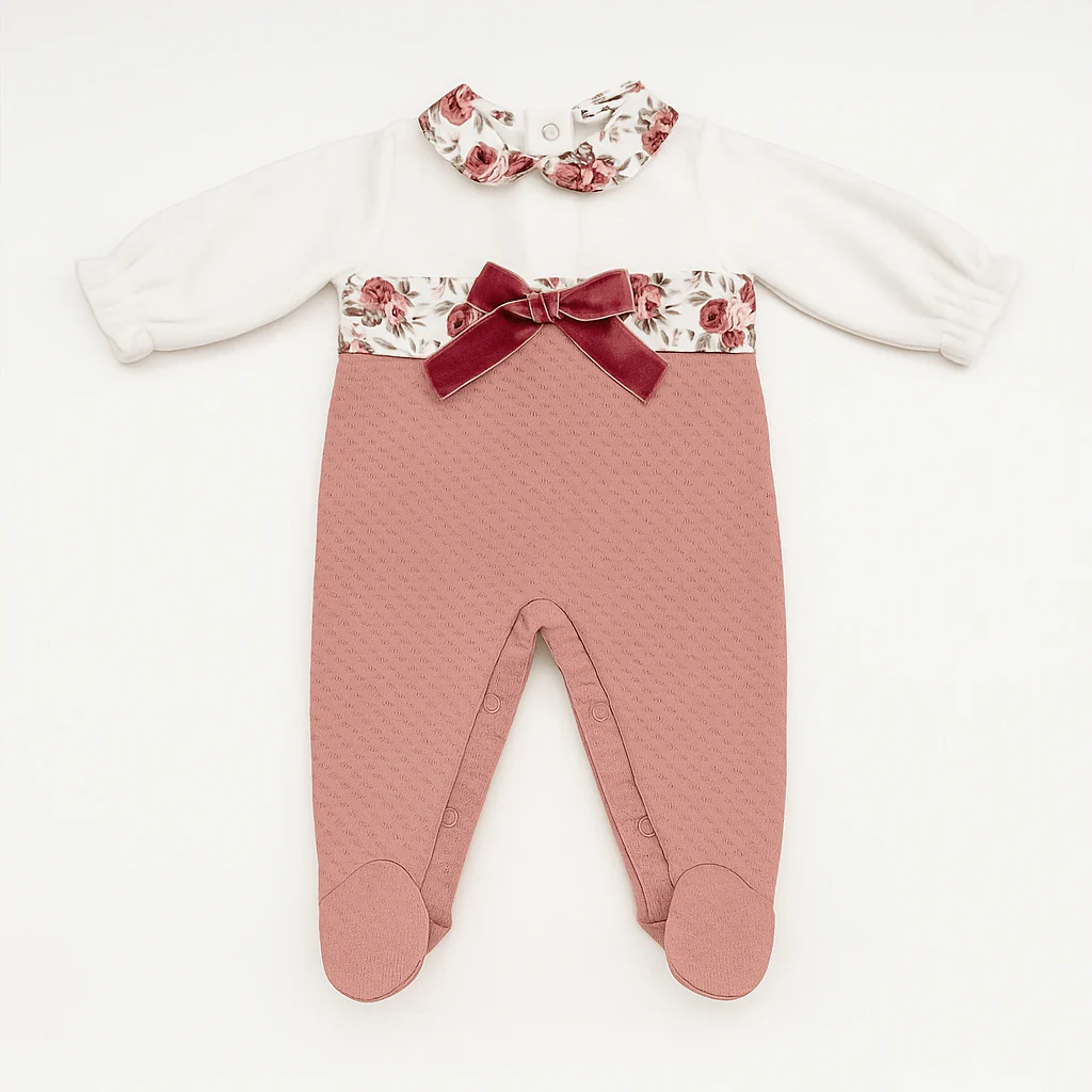 Tutina neonata in caldo cotone, con parte superiore bianca e colletto a fantasia floreale, impreziosita da fiocco in velluto rosa. La parte inferiore è rosa con lavorazione jacquard e piedini integrati. Chiusura con bottoncini automatici sul retro e lungo l’interno gamba comp: 100% cotonecod art: DBI25114