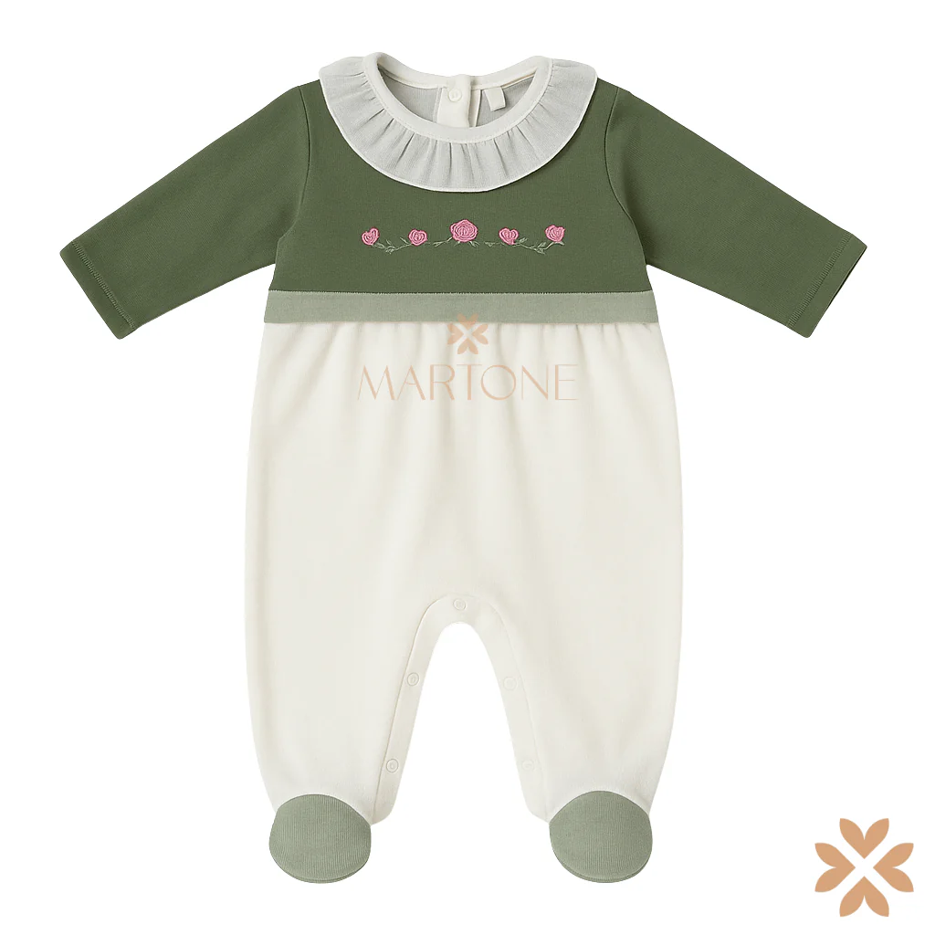 Tutina in ciniglia bicolore con parte superiore verde salvia e piedino panna. Il colletto in tulle e il ricamo floreale con roselline donano un tocco romantico e raffinato, perfetto per le prime uscite e le occasioni speciali della neonata. cod art: IM25N00