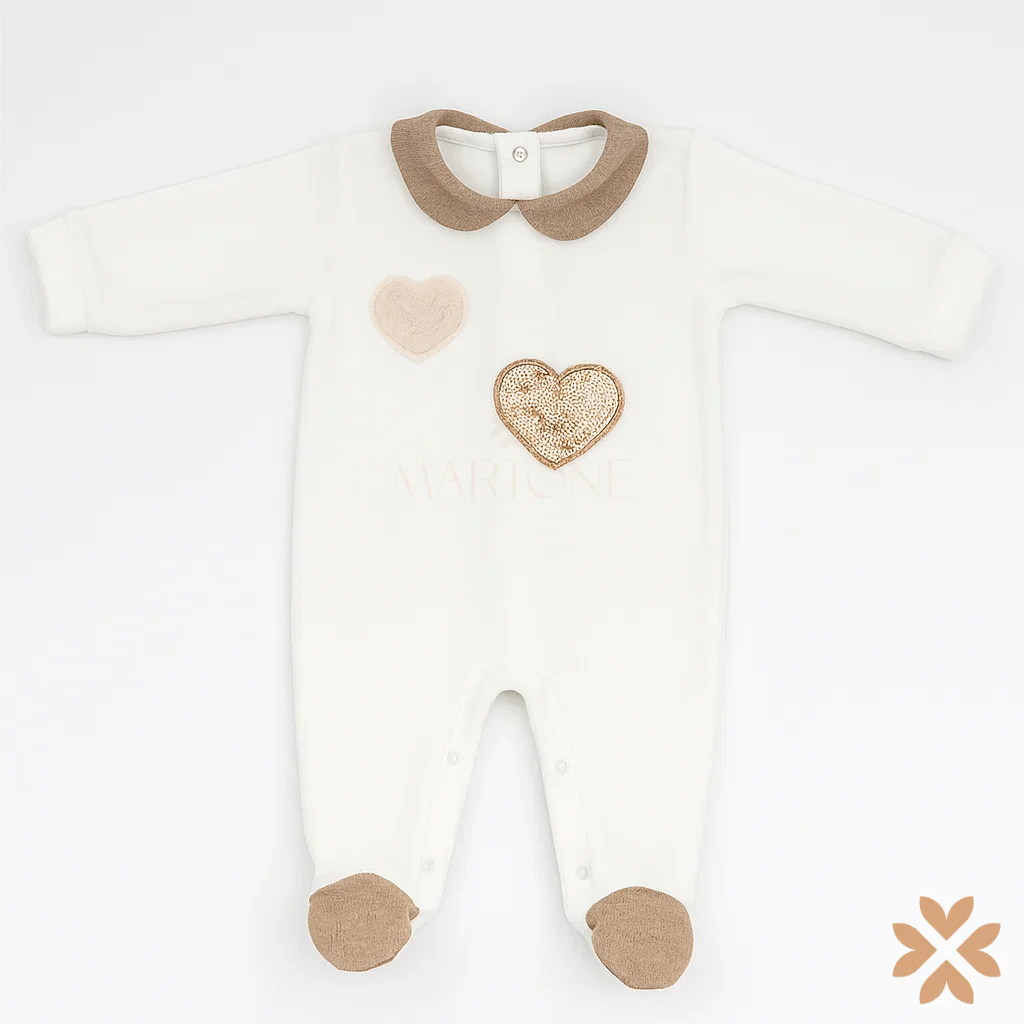 Tutina in ciniglia panna con colletto e piedini a contrasto beige, applicazioni cuore sul davanti di cui uno in paillettes. Apertura con bottoncini sul retro e al cavallo.