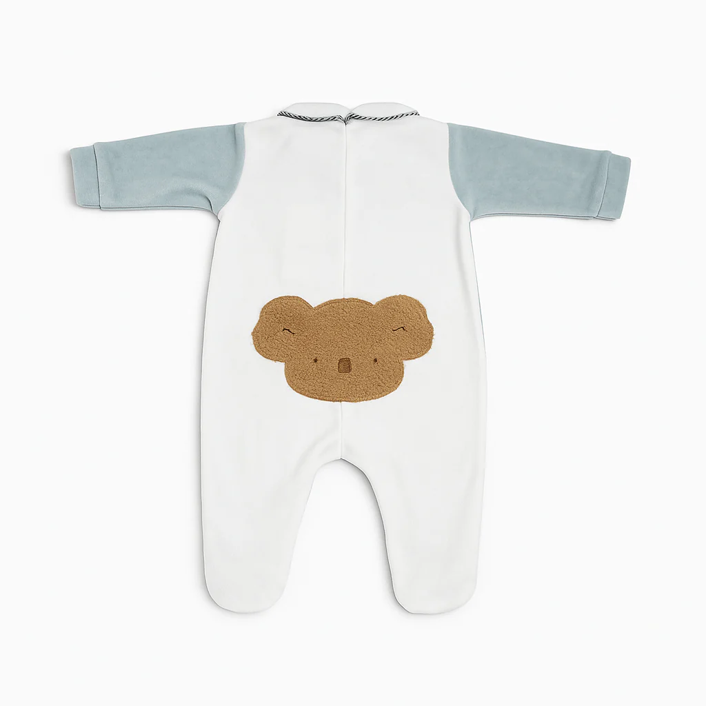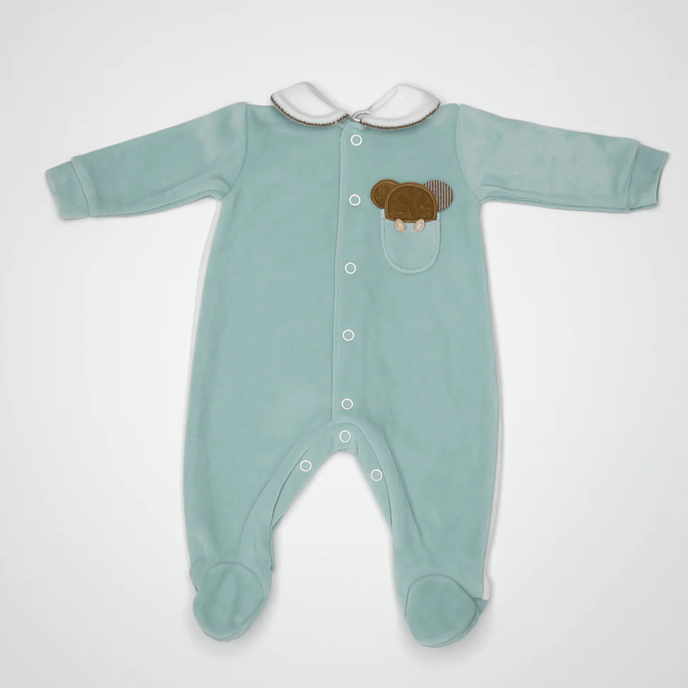 Tutina intera in ciniglia per neonato, con pratica abbottonatura frontale. Morbida e confortevole, pensata per avvolgere il bambino con delicatezza.