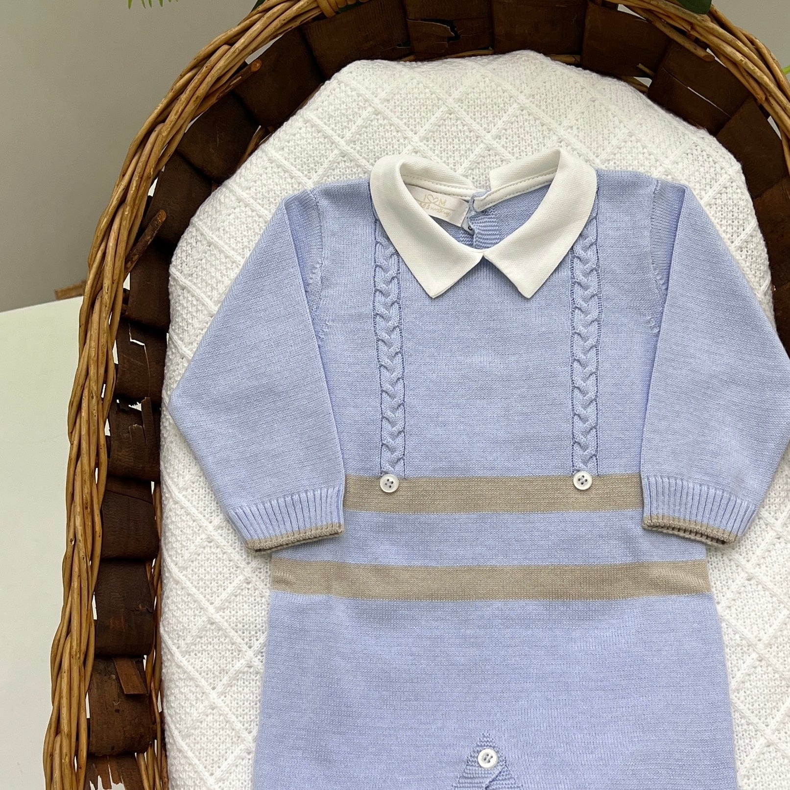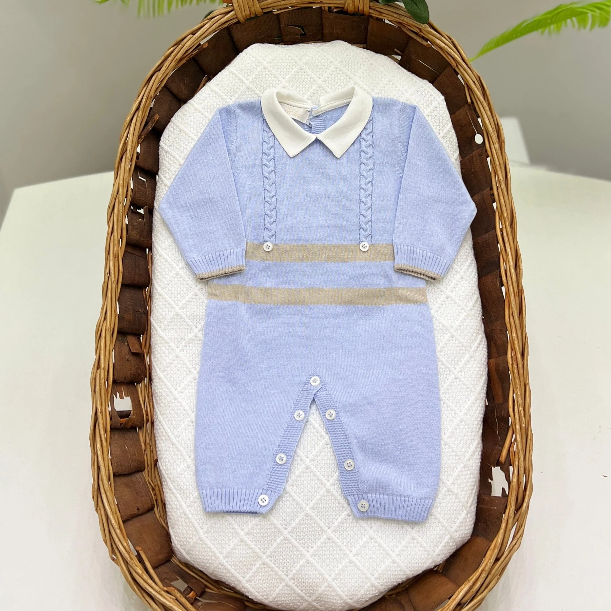 Tutina intera in filo di cotone con fantasia a righe celeste e tortora, arricchita da una delicata lavorazione a trecce e colletto in piquet. Elegante e comoda, perfetta per i primi giorni del neonato.