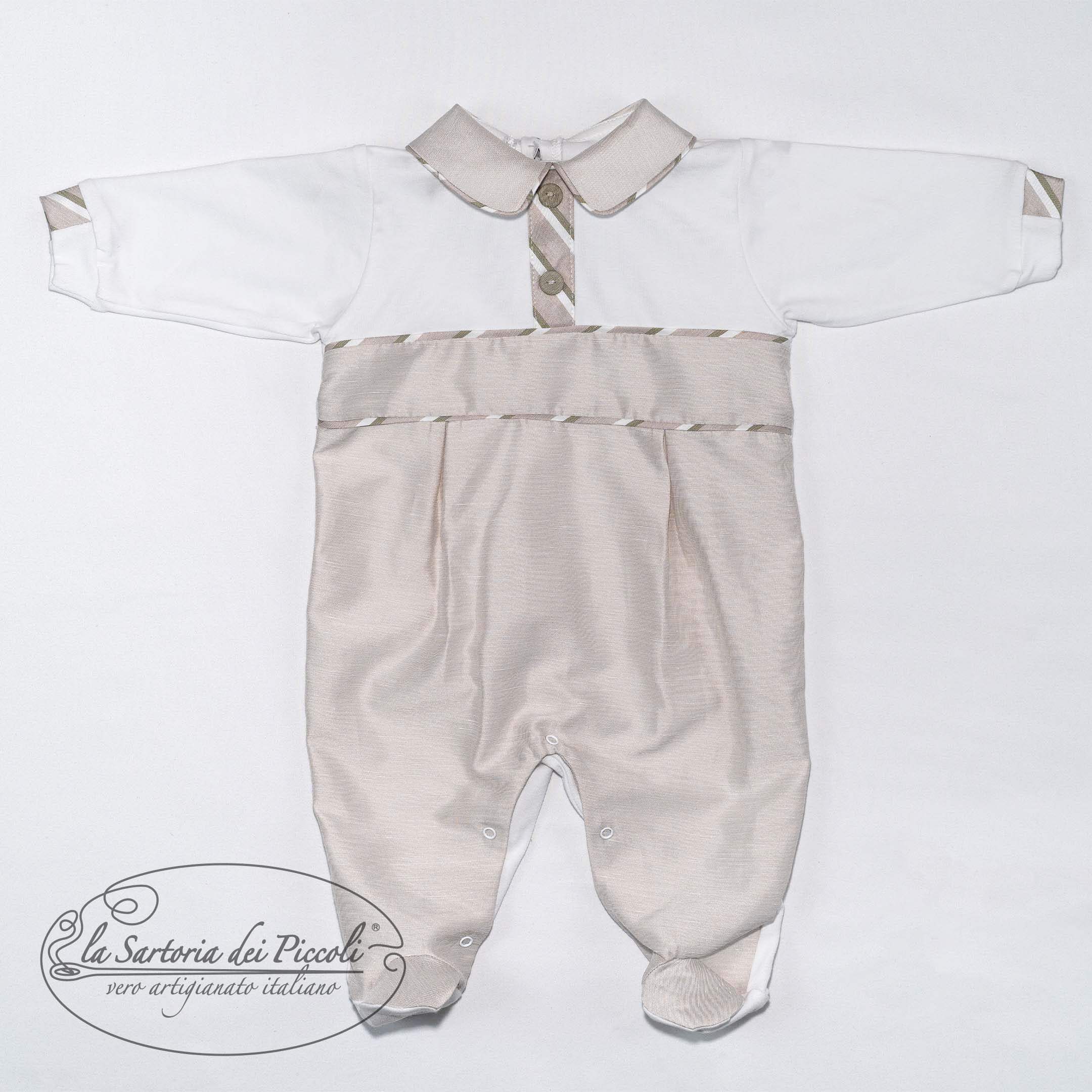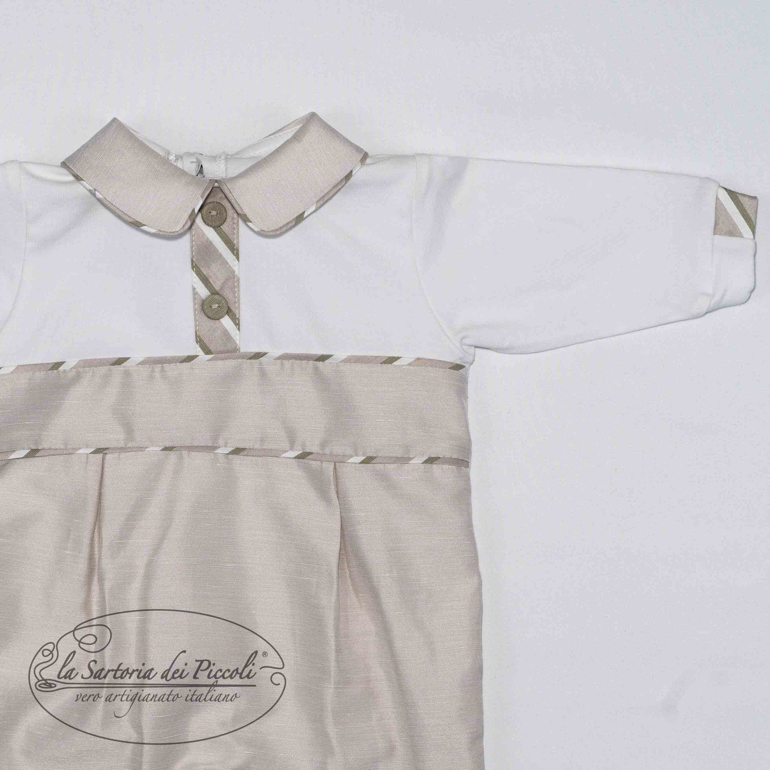 Tutina in cotone per neonato con colletto a contrasto e dettagli a righe verdi. Un design semplice e elegante, ideale per un look comodo e curato. cod art: LT1008100% cotone