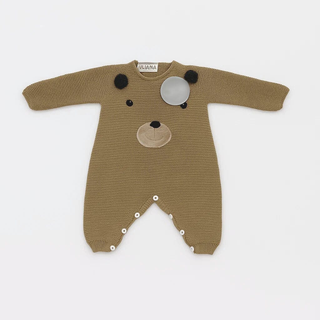 Tutina intera in lana per neonato con dolce viso di orsetto ricamato sul fronte. Un capo caldo e confortevole, perfetto per coccolare il piccolo con stile e tenerezza.