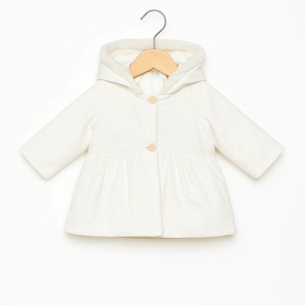Cappottino panna per neonata con cappuccio, caratterizzato da una linea morbida e delicata. Il punto vita è leggermente arricciato e impreziosito da un ricamo tono su tono che aggiunge un tocco raffinato. La chiusura frontale con due bottoni completa il modello con semplicità ed eleganza. Un capo caldo e dolce, perfetto per le occasioni speciali della stagione.